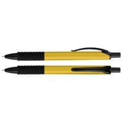 Bolígrafo "Vulcano" con cuerpo de color metalizado opaco y terminales negros. Escritura azul.