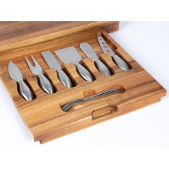 Espectacular tabla de madera sólida de ACACIA, con doble canal para picoteo, gran espacio central para quesos. Contiene 3 posillos de loza blanca para salsas + 6 cuchillos para cortar quesos + 6 tenedores pinchos de queso, de Acero inoxidable , en 2 compartimentos inferiores retráctiles. Madera trabajada y acabada en máquina, de forma 100% regular, con superficies y cantos lisos y suaves, para una mayor higiene y comodidad al momento de cortar y servir los quesos.